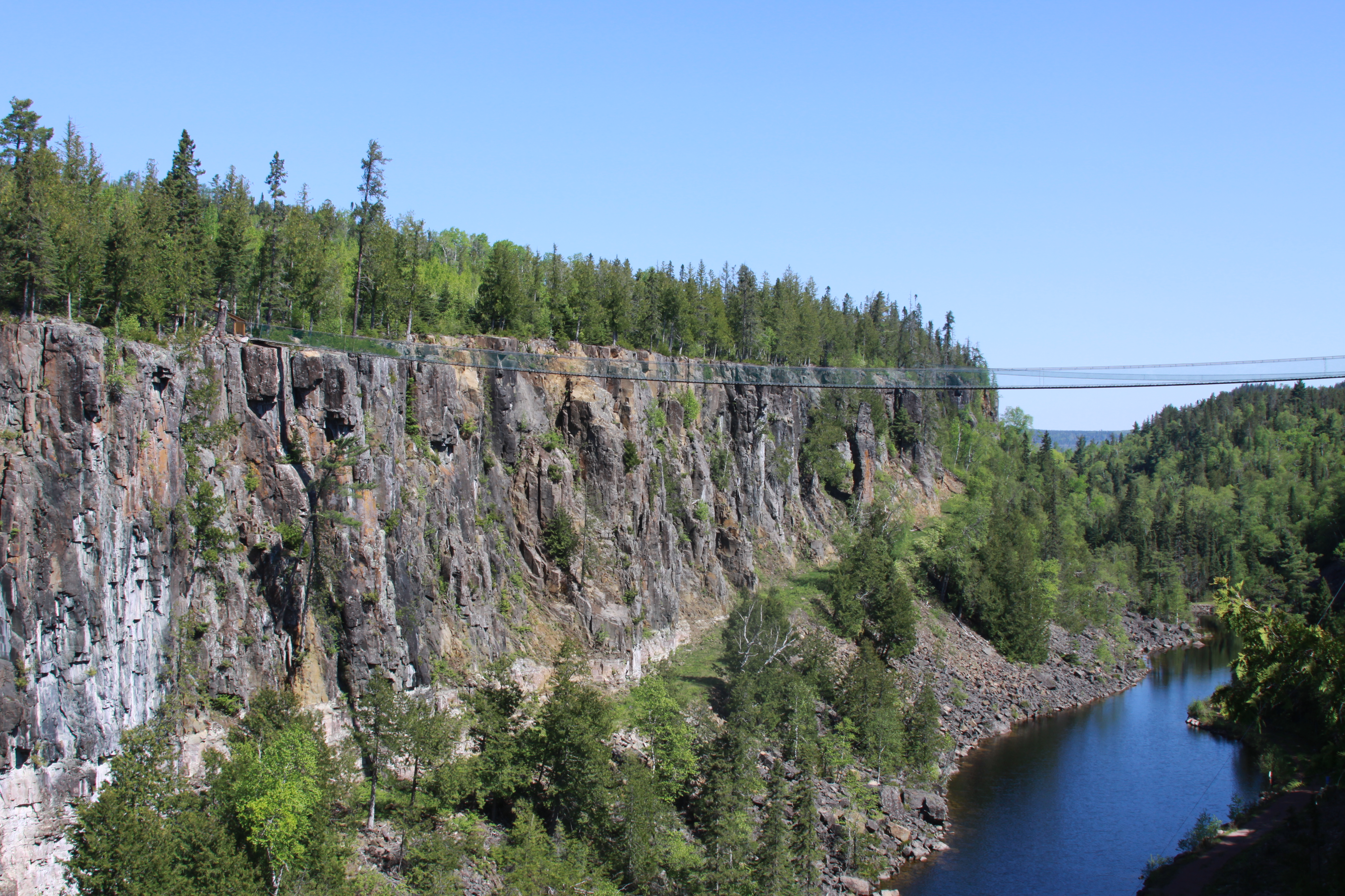 Our plan for Day 7 is quite simple. We’re rounding the most northern part of the lake and making our way towards Thunder Bay. Along the way, we’re stopping by Canada’s longest suspension bridge. We also plan to shop in Thunder Bay and do some sightseeing. By early morning we’ve made our way to Eagle Canyon Adventures where Canada’s longest suspension bridge awaits to be crossed. It is $20 per person to walk across the bridge. I’m skeptical of the fee but we pay it anyway. It turns out the bridge is in fact long… 600 feet long to be exact. And, there are not one but two bridges for us to cross. I’m not a huge fan of heights. I’m less of a fan of feeling suspended in air, hundreds of feet above a canyon. But, I grin and bear it. The sun beats down on us as we make our way across.