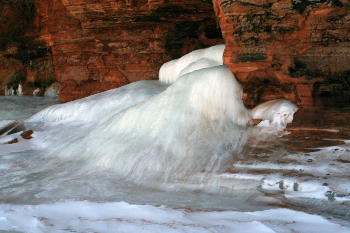 The hike is flat. You are hiking along the shores of Lake Superior and on Lake Superior. It is about 2-miles round trip. But, it is an easy 2-miles in terms of having interesting things to check out for a portion of that hike. Be sure to bundle up as the wind off the lake can be brutal. That said, the windier it has been prior to your visit, the cooler the ice formations will be hanging off the caves. Many times, you can actually see the curved ice that formed as the wind literally froze the run off coming off the caves. If you find yourself making the trek up to hike within the Sea Caves, only to learn conditions have changed and it is unsafe to visit the caves, consider taking the hike that runs along the shore on top of the sea caves. While views are limited, it is a great winter hike.